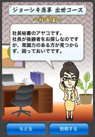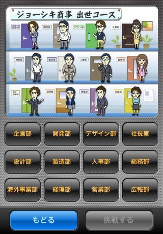 「出世コース」では、「ジョーシキ商事」の各部署〜社長室、企画部、開発部、デザイン部、設計部、製造部,、人事部、総務部、海外事業部、経理部、営業部、広報部〜の各部門のキャラから出題される問題に答えて昇進し、社長就任を目指します。