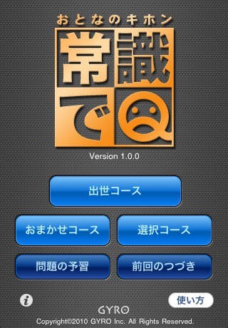 おとなのキホン「常識でQ」。社会人なら知っておきたい常識問題が楽しく解けるクイズゲームです。就職活動中の人にも、社会人のおさらいにも役立つクイズが満載で、問題数900問という充実した内容です。周囲にいそうな12人の面白会社人間キャラからのクイズに答えて昇進する「出世コース」をクリアすれば、あなたも社長に!