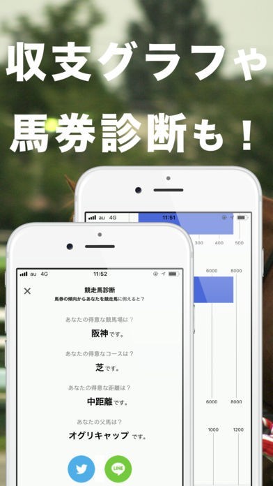 競馬の収支を自動計算してくれるだけでなく、馬券ごとの収支グラフや馬券診断の機能も搭載しています。競馬好きをサポートする多くの機能を搭載しているのでオススメアプリとなっています。