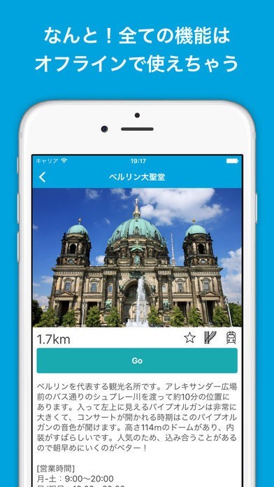 このアプリでは、オフラインで使えるベルリンの人気スポット情報が掲載されています。それぞれについて詳しく情報が載っているので旅行に実際に行く前に事前学習にも使うと良いです。