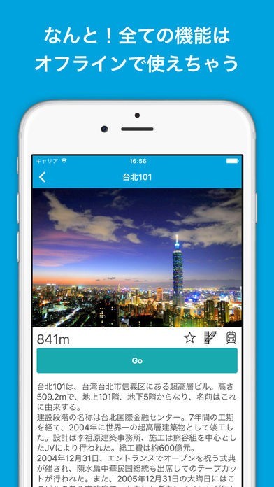 海外旅行に行くと、困るのが通信電波の確保です。アプリでは全ての機能がオフラインで使えるので、WiFiが届かない場所でも安心です。いつでもどこでも台湾のガイドを見ることができます。