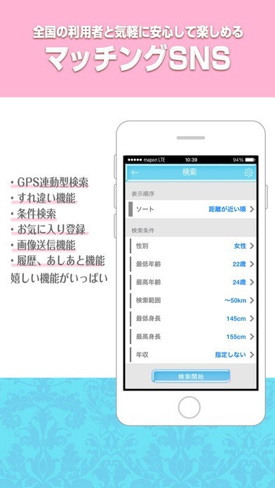 画像送信機能が搭載されているので、相手の顔はもちろん、自分の顔写真を送ることもできます。また自分が探したい異性・同性の条件を設定して検索することもできるので、便利です。