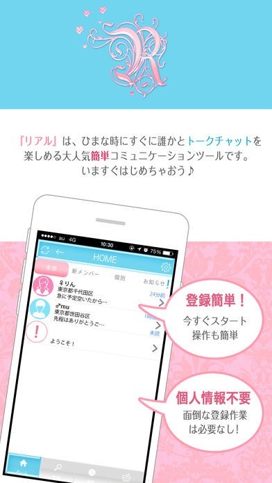 個人情報を登録することなく、すぐにアプリをスタートさせることができます。時間が空いた時に異性との出会いはもちろんのこと、同じ趣味を持つ人とつながるツールとしても使えます。