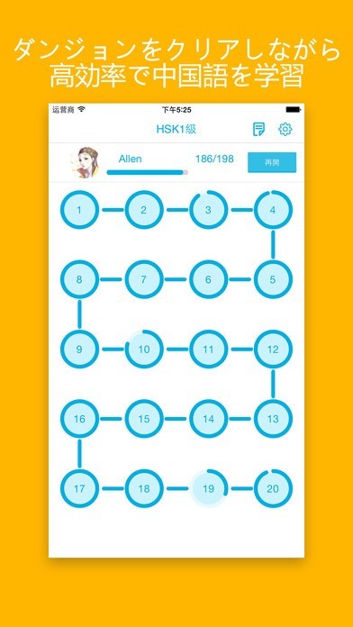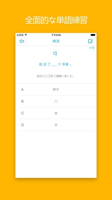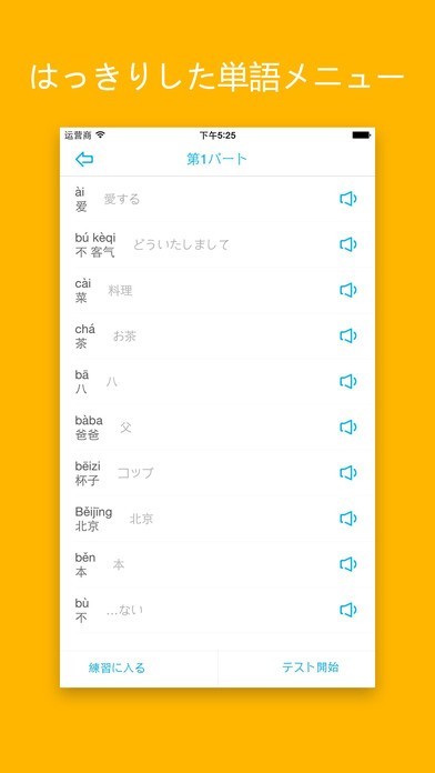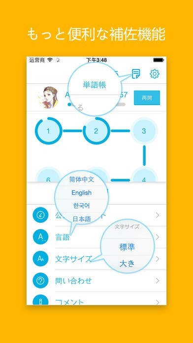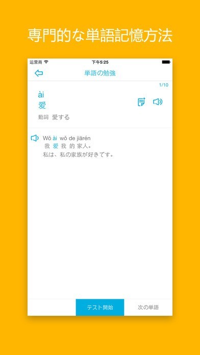 日常生活や、ビジネスシーンで使える中国語をマスターするための一つのステップとしてHSK1級語彙を増やすことを避けては通ることができません。「中国語/共通語を学ぶーHSK1級語彙」では、ゲーム感覚で一つ一つステップをこなせば自然と語彙を増やすことができる仕組みになっています。それぞれのステップで学ばなければいけない単語の設定がわかりやすく無理なく続けられます。設定画面からは文字の大きさや単語帳の管理が行えるためあなたの中国語学習を徹底的にサポートしてくれます。