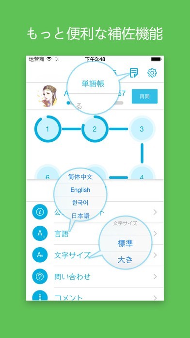 このアプリは、中国語の単語を集中的に学べる勉強アプリです。 毎日の課題が決められているので習慣的に勉強出来るようになり、効率的に中国語を学べます。 毎日の課題をクリアするとマスがどんどん埋まっていく仕組みになっているので、毎日のやる気をアップさせてくれます。 文字のサイズなど細かな設定が変更出来るので、自分の勉強しやすい環境を作ることも可能です。 また課題だけでなく単語帳としても使えるので、覚えにくい単語や苦手な単語は単語帳を使って覚えられます。