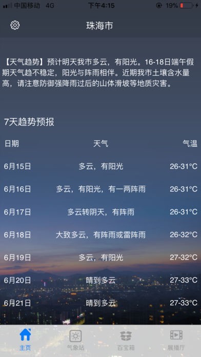 App Storeより引用“珠海风云”手机客户端(APP)是由珠海市气象局官方权威提供的天气信息免费应用软件,由珠海市公共气象服务中心建设管理维护。主要发布常规天气预报、突发天气预警、实况监测信息、卫星雷达图和气象生活指数等。