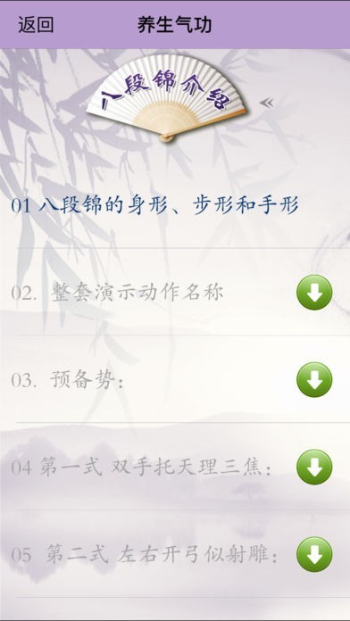 App Storeより引用养生三宝:精、气、神。《养生气功》包括五禽戏、六字诀、八段锦、易筋经、洗髓经、太极养生杖六个养身气功。重在倡导以传统养生健体之法来强健体魄,祛病强身,养足精气神!适合中老年人长期习练,有延年益寿的作用。六十七十不服老,八十九十贵似宝。百岁寿星不是梦,全凭自己来实现。