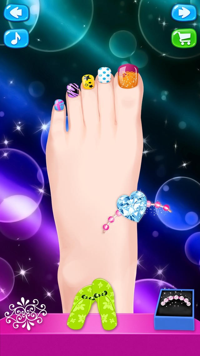 Foot Nail Spa takes you into the day spa where you can treat feet to make them feel soft and new and clean. You can be an artist and make a design that will WOW everyone! With TONS of options to choose from you can pick your favorite color and paint it directly on the nails! There are so many different kinds of decorations to choose from...Gems, Flower stickers, Sparkles, Patterns and Shapes, and so much more!