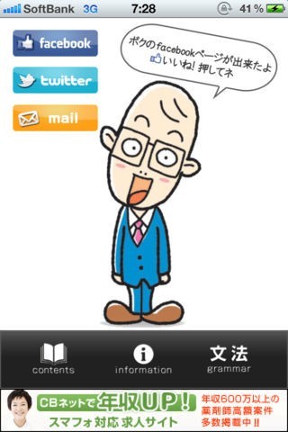 年齢を重ねていくと、英語を一から勉強していくのも一苦労です。そんな時に、楽しく笑いながら勉強できるのが「爆笑!英語学習サボリーマン」です。アプリ内にはサボリーマンの日常を描いた50個の例文が搭載されており、すべての例文に対してコミカルな絵が組み込まれているので、視覚にも分かりやすく覚えやすい仕組みになっています。例文自体も面白く、つい笑ってしまうものばかりなので頭に入ってきやすいようになっています。文法の解説記事もあるので、面白いだけでなくしっかりと英語を学ぶことができます。英語が苦手という方にも、楽しく学べること間違いなしのアプリです。