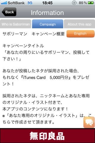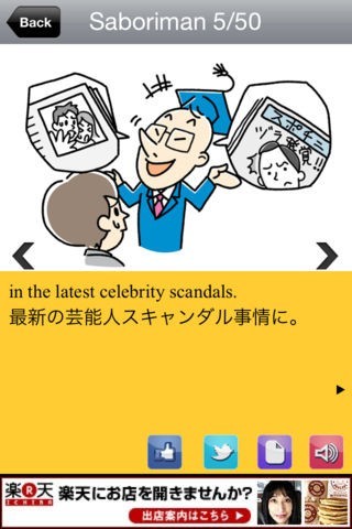 仕事をサボりがちなキャラクター「サボリーマン」にまつわる英文で、楽しく英語を学ぶことができる英語学習アプリです。英文と意味に加えて面白いイラスト付で理解しやすくなっています。思わず笑ってしまうようなユニークな英文の内容ですが、ネイティブのアメリカ人英語講師が作成しているので、英文も意味もしっかりしたものになっています。 英文に使われている単語や文法の藍説があるので本格的な英語の勉強もできます。ネイティブによる英文の音声も聞くことができるのでリスニングも鍛えられます。