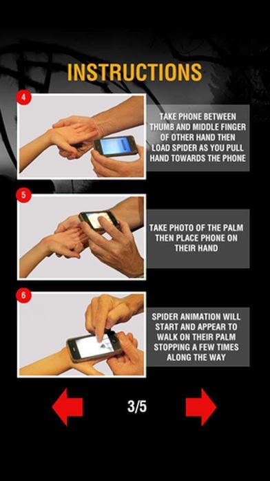 観客の手ひらの写真を撮り、同時にこっそりとプラスチック製のクモを手の甲に貼り付けます。観客の手にスマホを置くと、クモが画面上に現れます。クモが歩くとその振動を感じることもできます。
