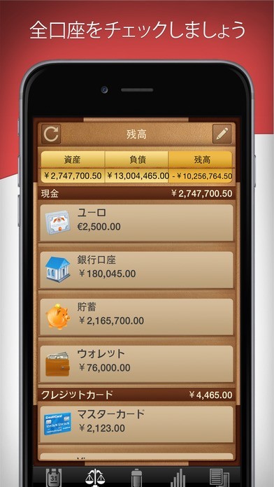 外貨やクレジットカード、ウォレットなどの管理も出来る