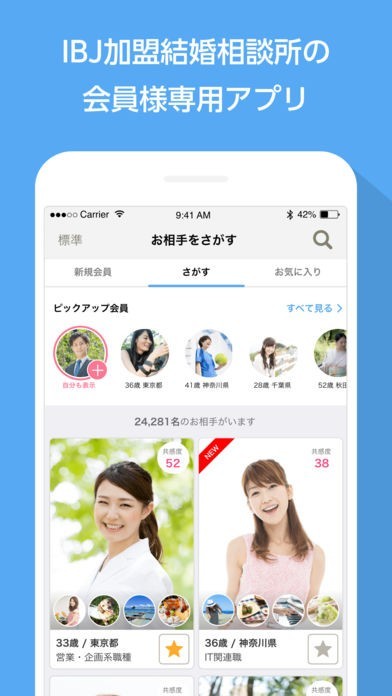 IBJSは、会員専用のお見合いを組むことができるシステムです。結婚を考えたときに、出会いから成婚までをサポートしてくれます。共感マッチ機能では、性格や考え方がわかる2択の質問に答えていきます。より価値観の近い異性を見つけることができます。プロフィールは制限無しで閲覧できるので、相手のことをもっと深く知りたいときに便利です。 プロフィールに使う写真は、5枚まで投稿が可能です。本人写真だけでなく、趣味や好きなものの写真を投稿できるので、自分自身をアピールしやすいです。異性からいいねをもらったり、いいねを送ることもできます。お互いの気持ちをいいねで伝えることでわかりあえ、出会いが始まります。