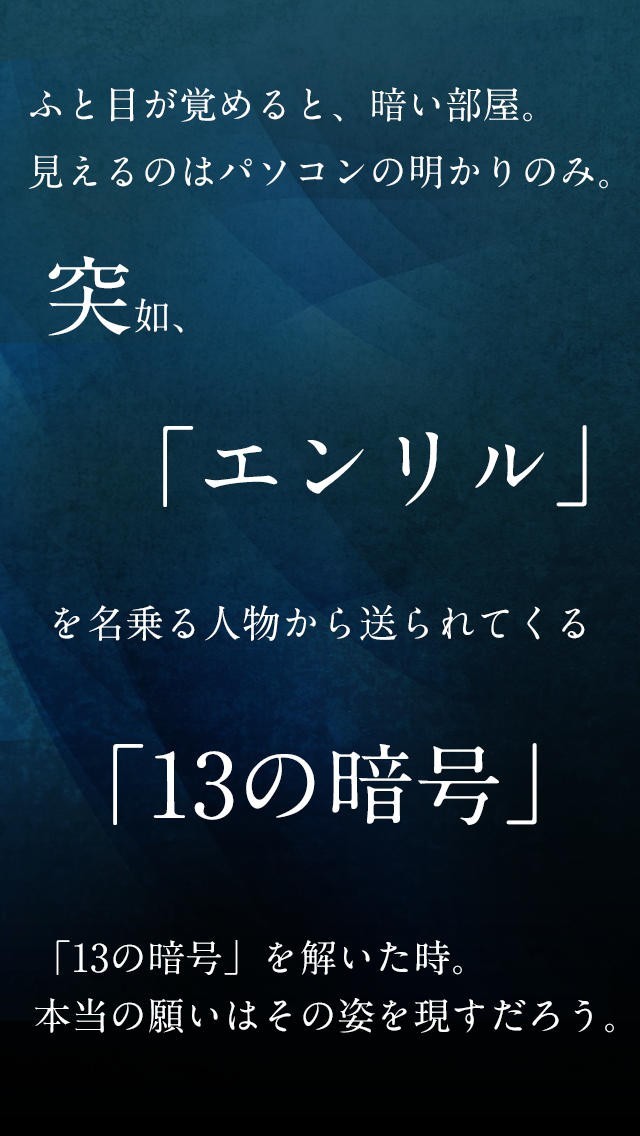 突然パソコンを見るとエンリンを名乗る人物から送られてくる13の暗号を解いていくアプリ!