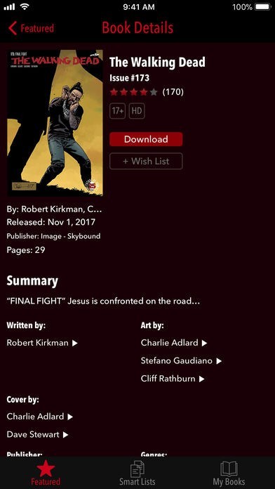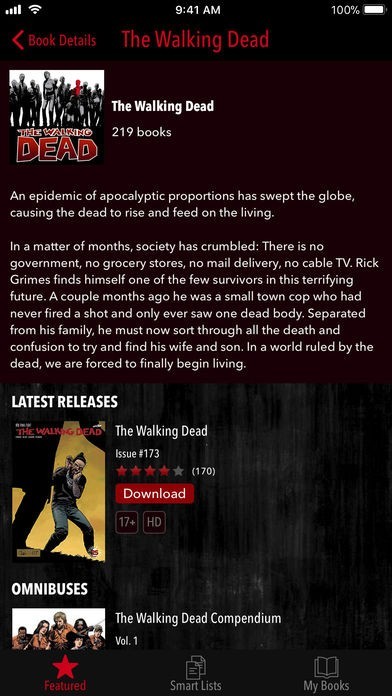 App Storeより引用Read the blockbuster comic series that's now a hit TV show! The first issue is free, and the rest are available via in-app purchase. An epidemic of apocalyptic proportions has swept the globe, causing the dead to rise and feed on the living. Presented in comiXology's cutting edge Guided View™ Technology.Find out about all things The Walking Dead from www.TheWalkingDead.com and www.Skybound.comIn a matter of months, society has crumbled: There is no government, no grocery stores, no mail delivery, no cable TV. Rick Grimes finds himself one of the few survivors in this terrifying future. A couple months ago he was a small town cop who had never fired a shot and only ever saw one dead body. Separated from his family, he must now sort through all the death and confusion to try and find his wife and son. In a world ruled by the dead, we are forced to finally begin living.