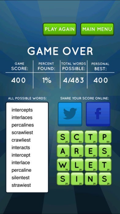 英単語を使った簡単なパズルゲームを遊ぶことができるアプリです。縦横斜めのどこ並びでもいいのでアルファベットをなぞっていき英単語を完成させましょう。制限時間内に何個の単語を導き出せるかを競っていきます。