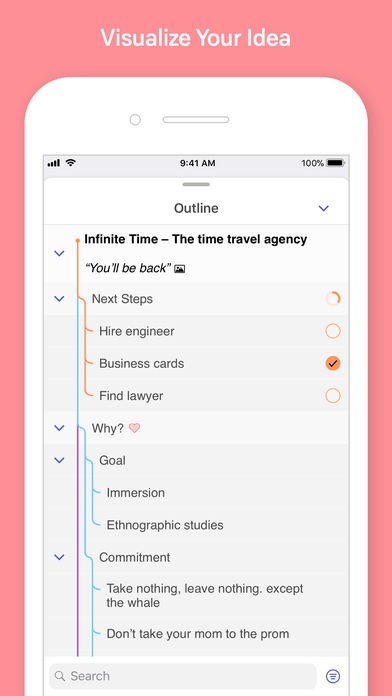 MindNode helps clarify the context and connections from one thought to another. Add individual styles to text and nodes to understand complex information at a glance. Outline view gives a new perspective on the flow of ideas.