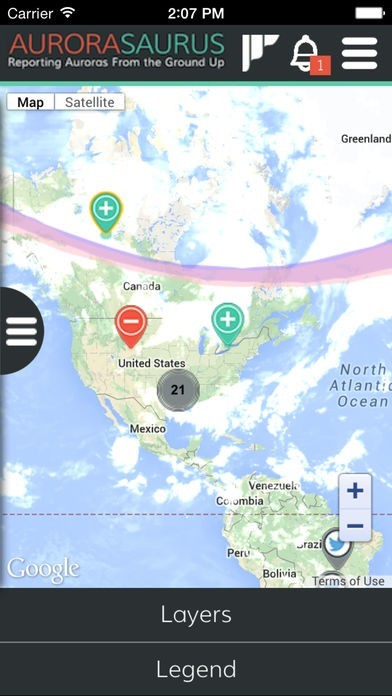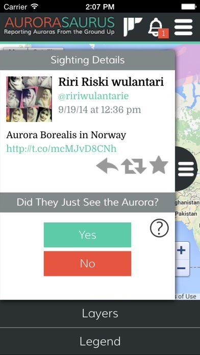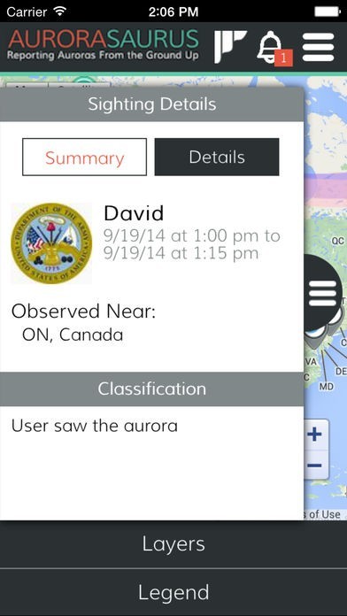 Additional features include the capability to register and receive location-based notifications, a real-time monitor of space weather activity, the capability to help verify tweets and search for real sightings, the answers to your questions, and more. We are free of charge and advertisements.