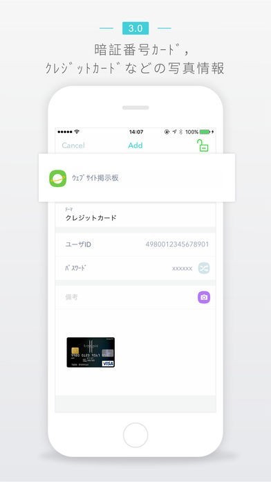 このアプリでは、IDやパスワードと言った文字情報だけでなく、写真情報も記録してあげるのでクレジットカードの画像を登録しておけばいざクレジット情報が必要な時にすぐ引き出せます。