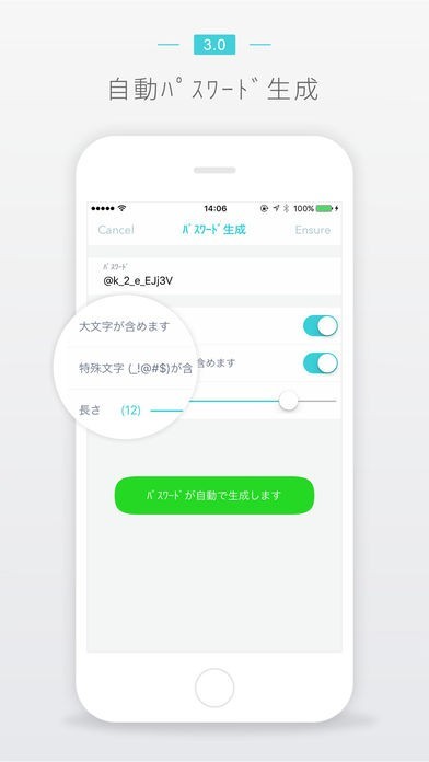 自分でパスコードを考えられないときに便利なパスワード生成機能が搭載されています。大文字・特殊文字を含めるかや文字の長さを設定して生成ボタンをタップするだけで自動的に生成してくれます。