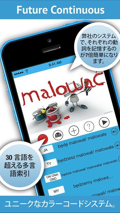 App Storeより引用い評価を受けているこの斬新なメモリー・アプリケーションにより、効率的に英語 の鍵となる動詞変換を、従来の7分の1の時間で学習していただけます。またこのアプリケーションにはネイティブ・スピーカーによる英語の発音がついており、どのレベルの学習者にもお使いいただけます。