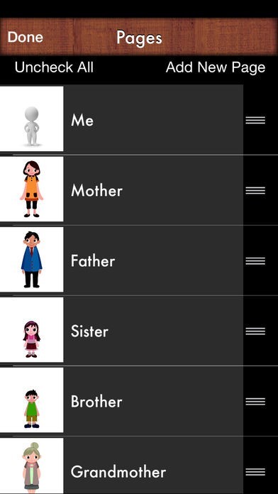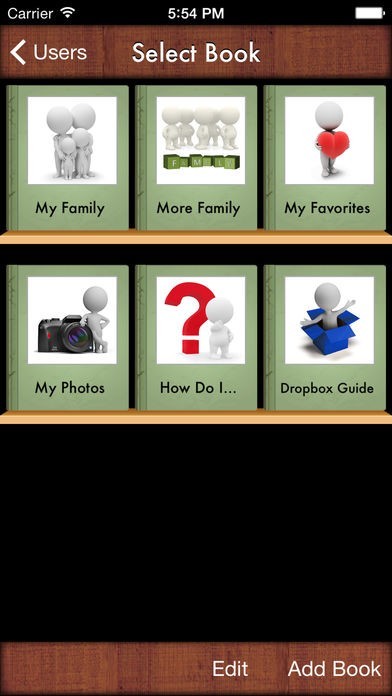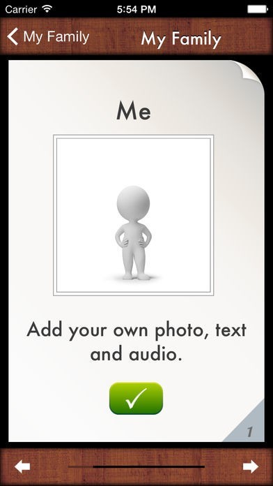App Storeより引用i Get… My Family Photo Books is an app that allows total customization of photo albums, offering picture, text and audio support to individuals learning about people in their family. This app contains a photo album with nine pages labeled with titles of immediate family members, however all the pages can be customized with your own photos, titles, text and audio as well as adding unlimited photo pages of more family members.