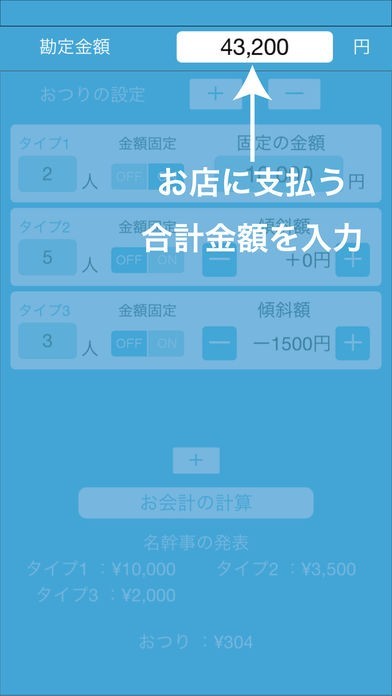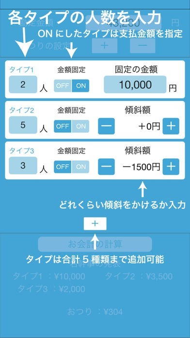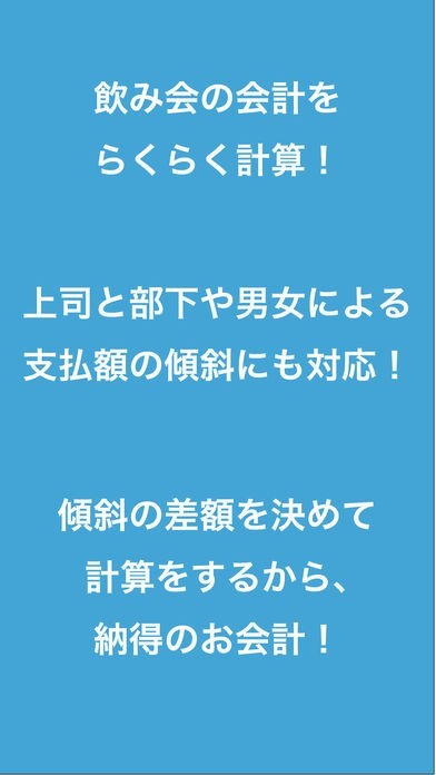 App Storeより引用飲み会のお会計で、傾斜をつけた会計の計算を楽に行えるアプリです。