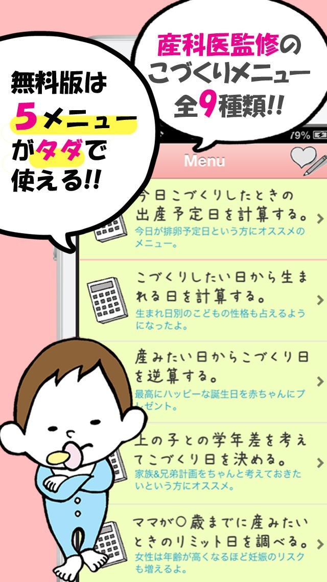 こづくり計算機は、子づくりのタイミングや避妊をするタイミングを知ることができるアプリです。妊娠出産は、人生の中で大きな転換期です。どのタイミングで妊娠すればいいのか計算することができる機能が付いています。今すぐに妊娠したい方だけでなく、兄弟の学年差を考えたり、何歳までに出産したいのかも計算できます。どのタイミングで子づくりをすれば、いつごろ出産を迎えるのかがわかります。子づくりメニューは9種類あります。 出産しても仕事を続けたい方にも産むタイミングは大切です。出産の計画を立てるためにも子づくりのタイミングを計算できる機能が役立ちます。