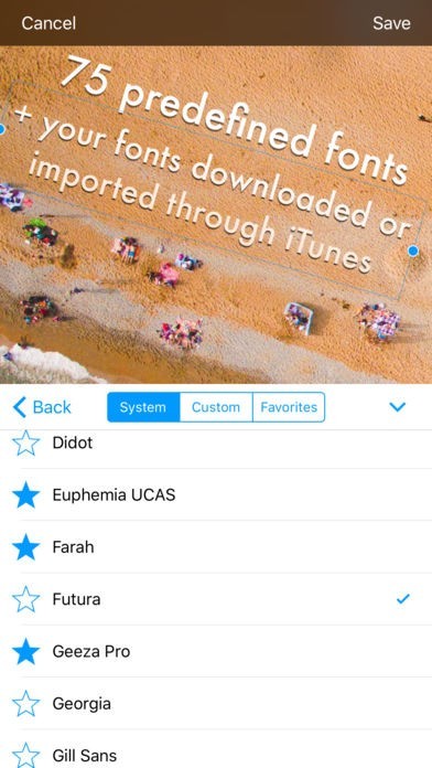 - add your own fonts by downloading from the internet, or importing in the app's Document folder through iTunes. The app can open .otf, .ttf fonts and .zip archives.