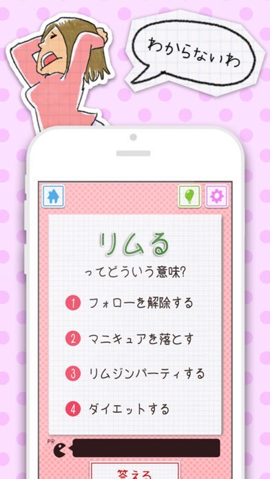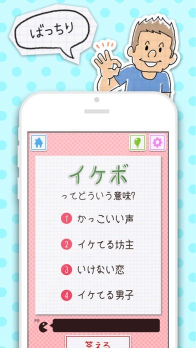 果たして自分は現代社会とどれくらいコミュニケートできているのか不安に思ったらこのアプリで調べてください。若者を中心に流行っている言葉を収録してあります。全問を正解できたなら何も心配することはありません。