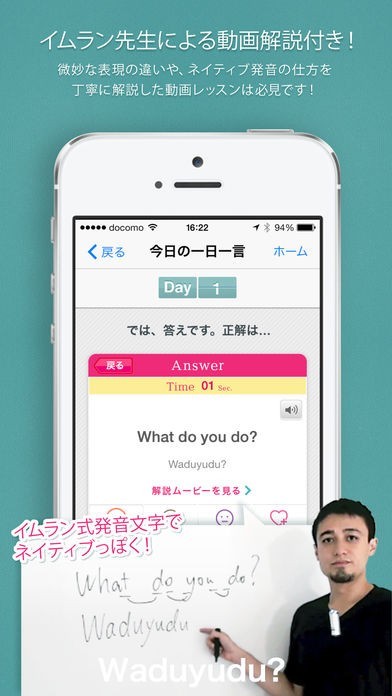 アプリ「英語・英会話一日一言」では、麻布十番にある大人気の英会話教室の校長先生が、英語のネイティブスピーカーが日常的に使う英会話のフレーズを毎日一言ずつ紹介してくれます。覚えるのは毎日一文だけ、文法や細かいことも抜きにして会話を覚える、というコンセプトなので、負担なく気軽に英会話学習をすることができます。