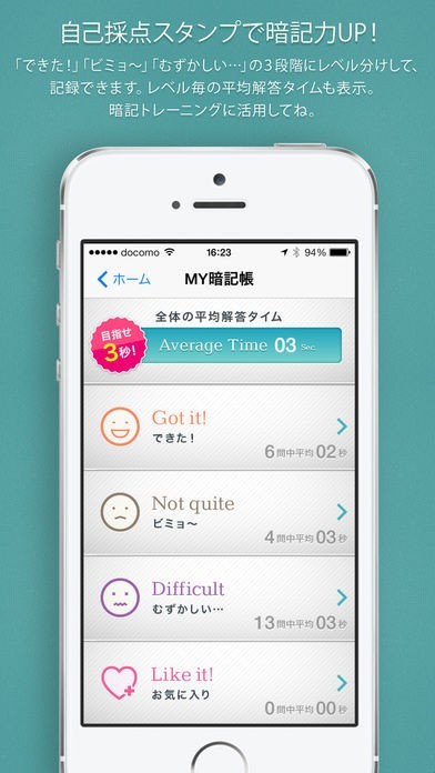 勉強したフレーズの定着度について、採点スタンプで管理できます。「むずかしい」マークがついているフレーズのおさらいや、クイズ形式の復習テストを活用すれば、さらに学習が深まります。