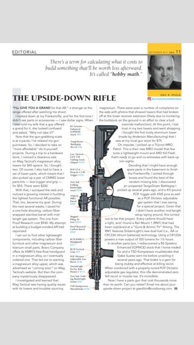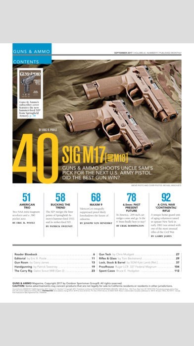 App Storeより引用Since 1958, Guns & Ammo has been the leading authority in presenting new rifles, pistols, shotguns, optics, suppressors and ammunition. Columns include a monthly identification and values, long-term holster evaluations, the latest in firearm technology as well as discussions on gun trends and training. Editors and contributors are sourced from the most experienced and well written authors with backgrounds ranging from military combat experience to law enforcement to ballistic science and competition. With each article, readers can enjoy easy-to-read narratives and reviews supported by the highest quality photography making G&A the world's most widely read firearms magazine.