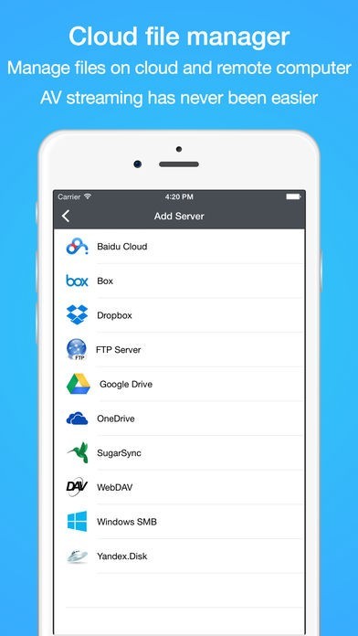 - AV streaming from various cloud storages and SMB/FTP/SFTP server has never been easier.