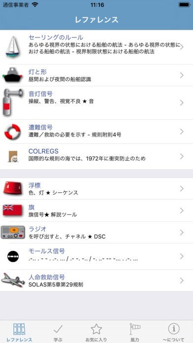 海に浮かぶ浮標や、海上に霧が立ち込め視界が効かない時の音信号に関する解説を読むことこができます。海上の衝突予防には欠かせない知識が満載の本アプリ、海で活動される方には欠かせないでしょう。