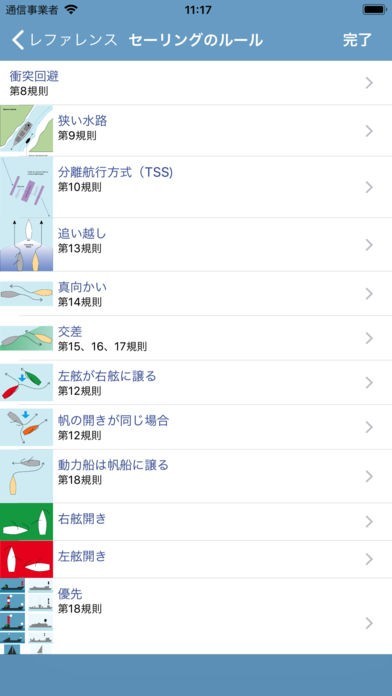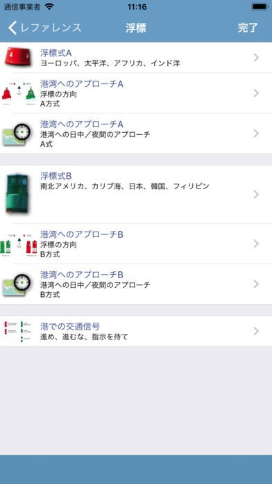 浮標の解説や信号の内容を説明するのに文章だけでは力不足です。本アプリは解説にイラストも豊富に使われているため、学習者の理解を助けてくれます。さらに各項目もアイコンが使われ内容が判別しやすいのも使いやすい。