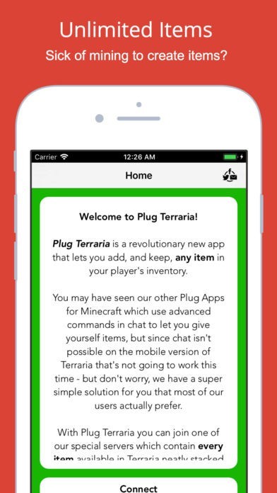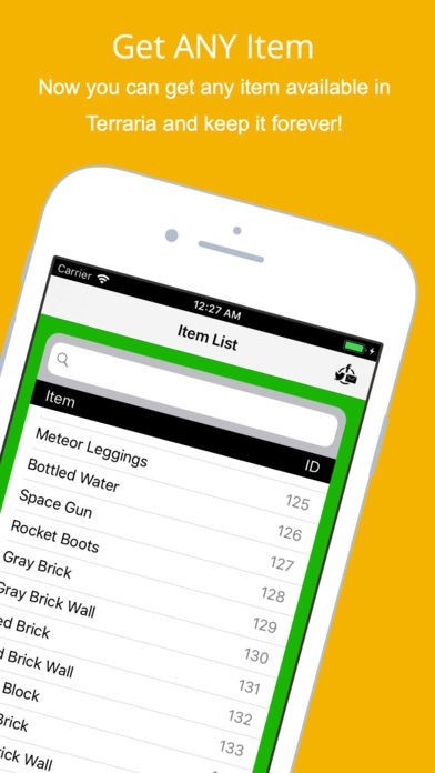 Now you can get any item in Terraria and use it in your own worlds or any multiplayer worlds. Need more items? No problem, open the app and get some more!