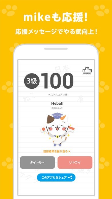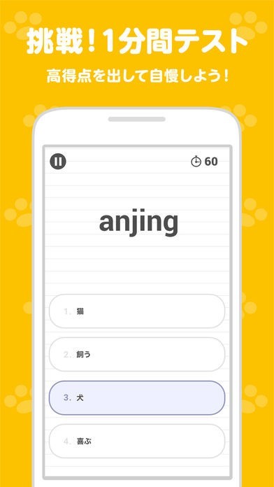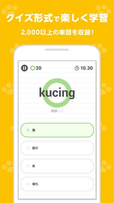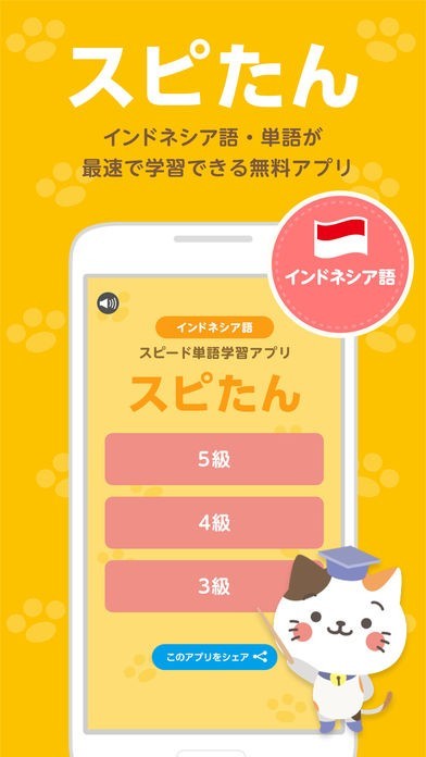 このアプリでは、インドネシア語の3級、4級、5級に相当するレベルの単語を学ぶことができます。デフォルメされた猫のキャラクターがクイズを出してくれるので、単語の暗記が楽しくできます。