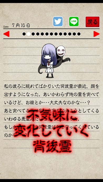 背後霊の姿が変化するごとに日記が更新され物語が進んでいきます。