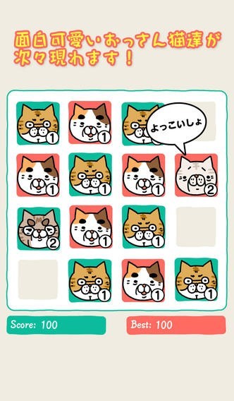 おっさん猫が描かれた絵をを1マスづつ移動させ、同じ顔のおっさん猫をくっつけ、違う種類のおっさん猫をどんどん連鎖させていく、面白くて可愛いゲームです。コンボを決められたら高得点のチャンスです。しかしコンボ中は新たな猫が追加されないので、コンボのさせ方にも工夫が必要になってきます。画面がいっぱいになり、おっさん猫同士をくっつけさせることができなくなったらゲーム終了です。コンボしたらおっさん猫の発する一言にも注目してみてください。おっさんらしい、思わず笑いが溢れてしまう一言が聞けます。どこか懐かしくて、癒され、単純ながらも頭を使わないと高得点を狙うことができないので、頭の体操にも利用できます。