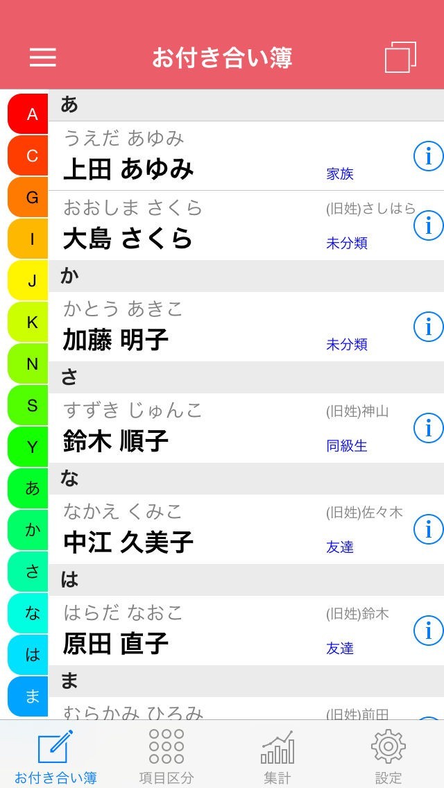 登録されているメンバーのリストはアルファベットや五十音順に並び替えることができます。家族や同級生など、続柄別に分類することもできるので調べたい相手が見つけやすくなります。