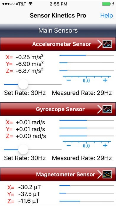 Scroll up and down the Sensor Kinetics Pro screen to see the many motion sensors in your iPhone. The advanced viewers show real-time measurements from all of the standard sensors available in your iPhone or iPad, including the gyroscope, accelerometer and magnetometer. Sensor Kinetics Pro provides a comprehensive look at the combined operations of all the kinetic (motion) sensors.