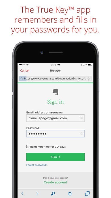True Key を使えば、もうパスワードを忘れる心配はありません。お気に入りのサイトに簡単にサインインできます。 スマートフォン、タブレット、コンピュータで True Key プロファイルを同期して、デジタル ID を簡単に管理できます。
