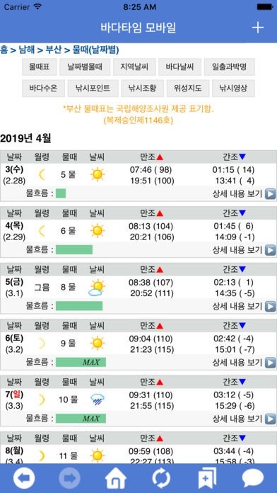 또한, 현재 2019년도 기존 지역의 물때와 날씨 및 바다갈라짐이 추가되었습니다. 기존의 지역 이름이 변경된 곳이 있으니 보시던 지역의 이름을 잘 확인하시기 바랍니다.
