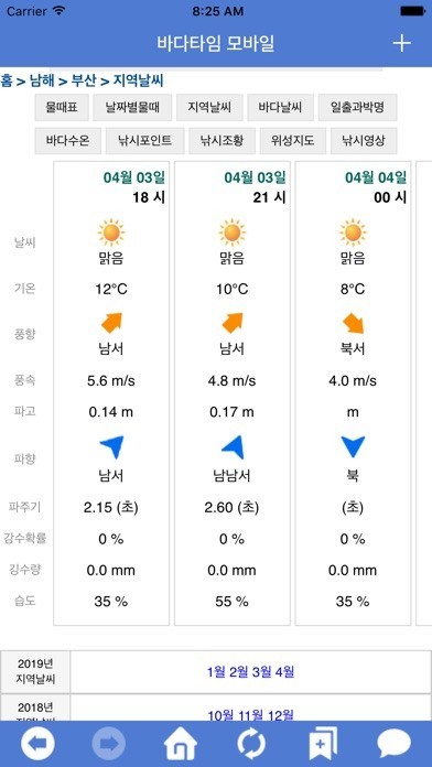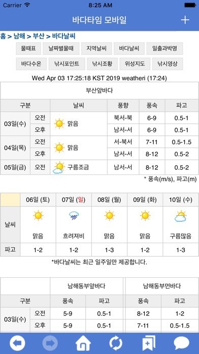 2. 바다타임에서는 바다 날씨 정보를 오전과 오후로 나누어 제공하고 있으며, 풍향, 풍속, 파고 정보를 동시에 제공합니다.