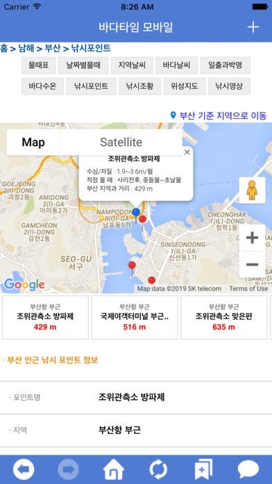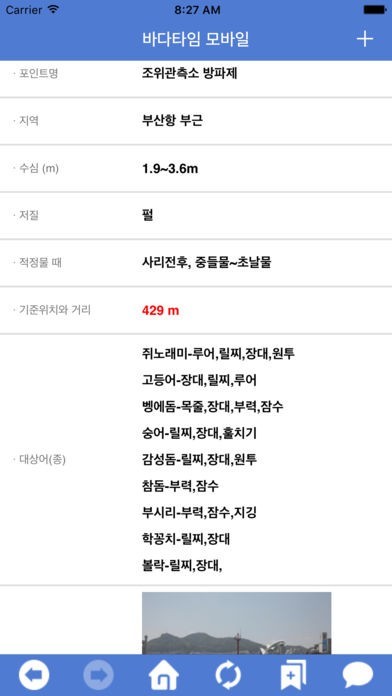 6. 국내 2000여개 지역의 바다 낚시포인트 정보를 제공합니다. 또한, 적정물때, 수심/저질, 대상어, 포인트 지역 사진, 기상조류와 계절별 주요 대상어종 및 평균 수온등을 제공하고 있습니다.