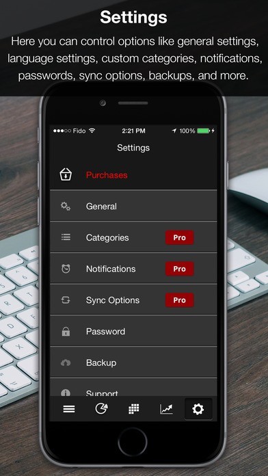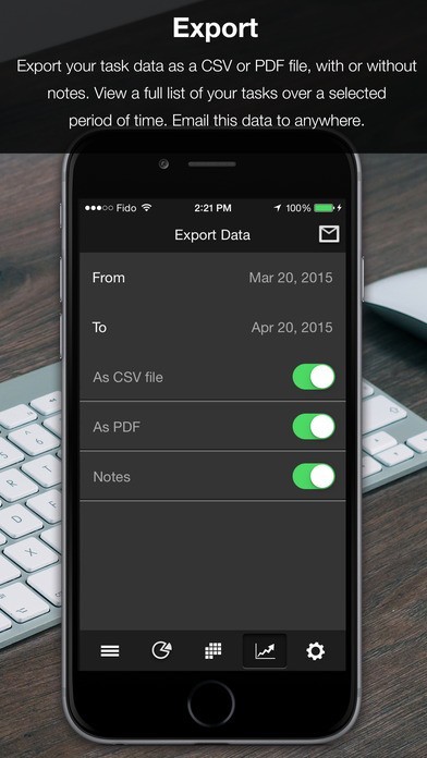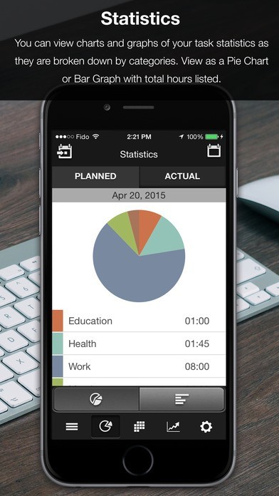 Busy users are provided with a flexible set of categories like “Meals”, “Health”, and “Work”. Tasks are then color coordinated by category for convenience and to monitor their statistics. The app employs in-depth pie-chart and bar graph diagrams to let users see how they spend their time based on category with a quick glance.