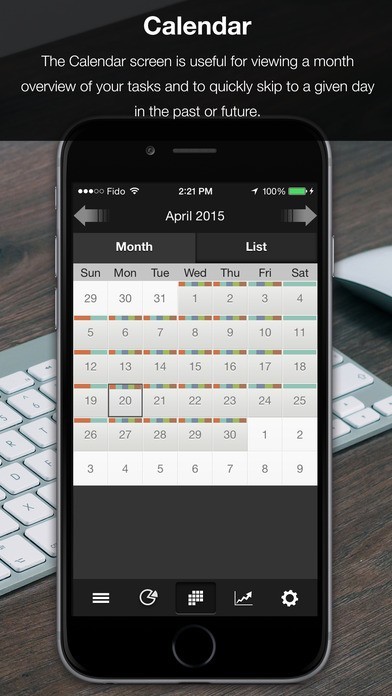 Tasks and full days can be planned in advance & viewed day-by-day via a practical graphic calendar or list view. See category colors mark each day on your calendar with planned tasks.