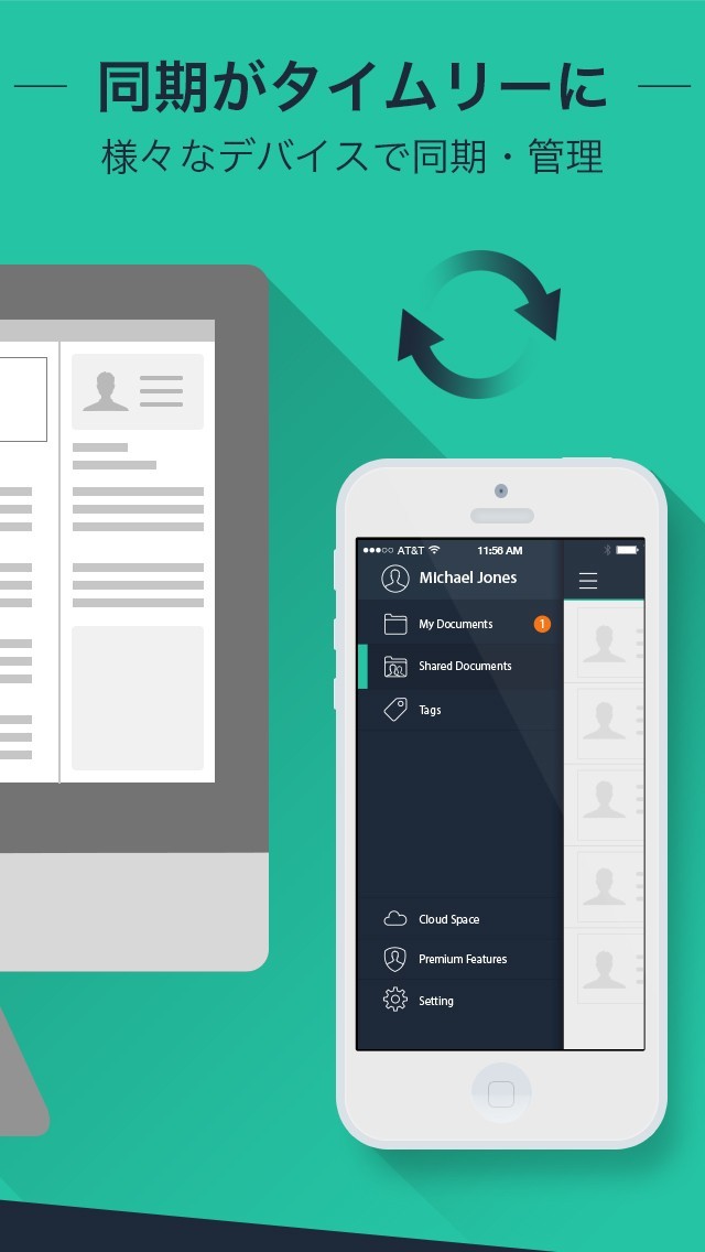 スマホ、タブレットやPC(www.camscanner.comを訪問)でアカウントにログインするだけで、いつでもどこでもドキュメントを同期、閲覧、編集や任意のドキュメント共有が可能。(登録ユーザーのみ)