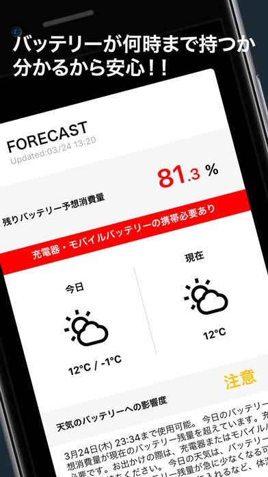 ユーザーのスマートフォンの利用状況を診断することでバッテリーに関する様々な情報を提供してくれるアプリが「電池予報 RealTime 2」です。現在の使用方法だとあとどのくらいスマートフォンのバッテリーが持つのかを正確に教えてくれたり、天気がバッテリーに与える影響などを教えてくれるので、バッテリーが切れてしまう前に充電をすることが出来るようになります。さらにどのアプリがバッテリーの消費に影響を与えているのかを3段階で表示してくれるので消費量が多いアプリを一目瞭然にしてくれるので、充電が難しい場合には消費量の多いアプリを優先的にストップしてバッテリー切れを防ぐことが出来ます。